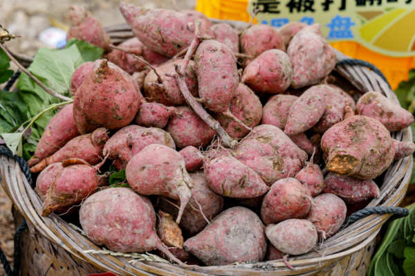 奋力挥动着小铲,挖出沾满泥土的红薯